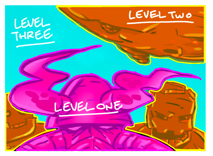 By coloring the line art, I enhance the three distinct visual levels in the drawing, strengthening the illusion of depth in my comic panel.