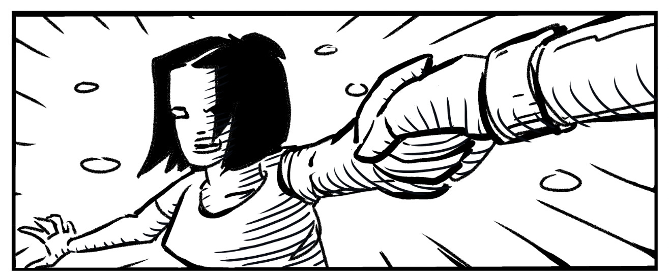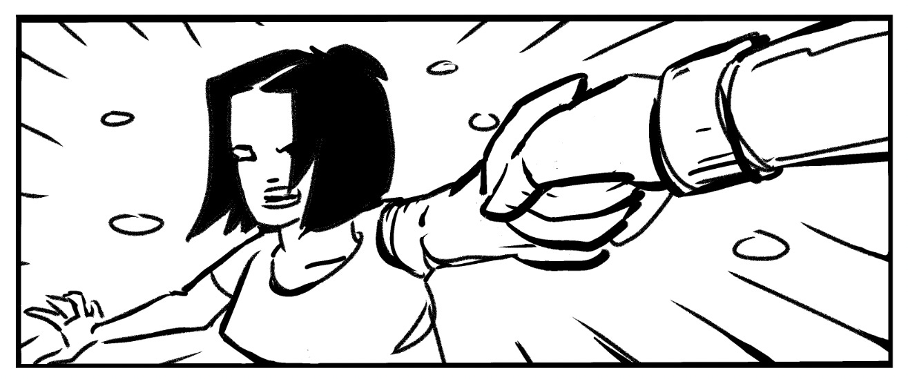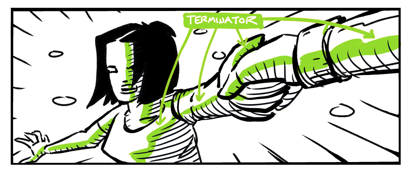 In the black-and-white version, the terminator is created through line weight. As the lines thicken and cluster, they recede into shadow, defining form and depth without the use of color.