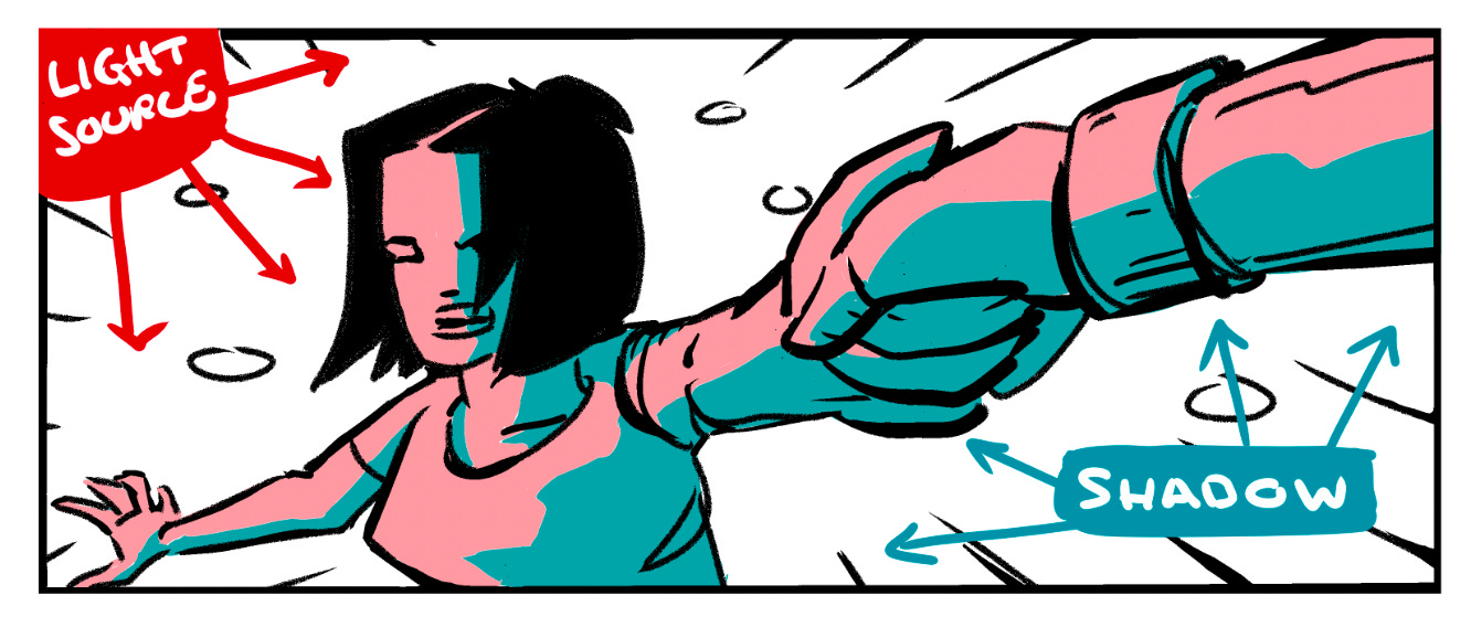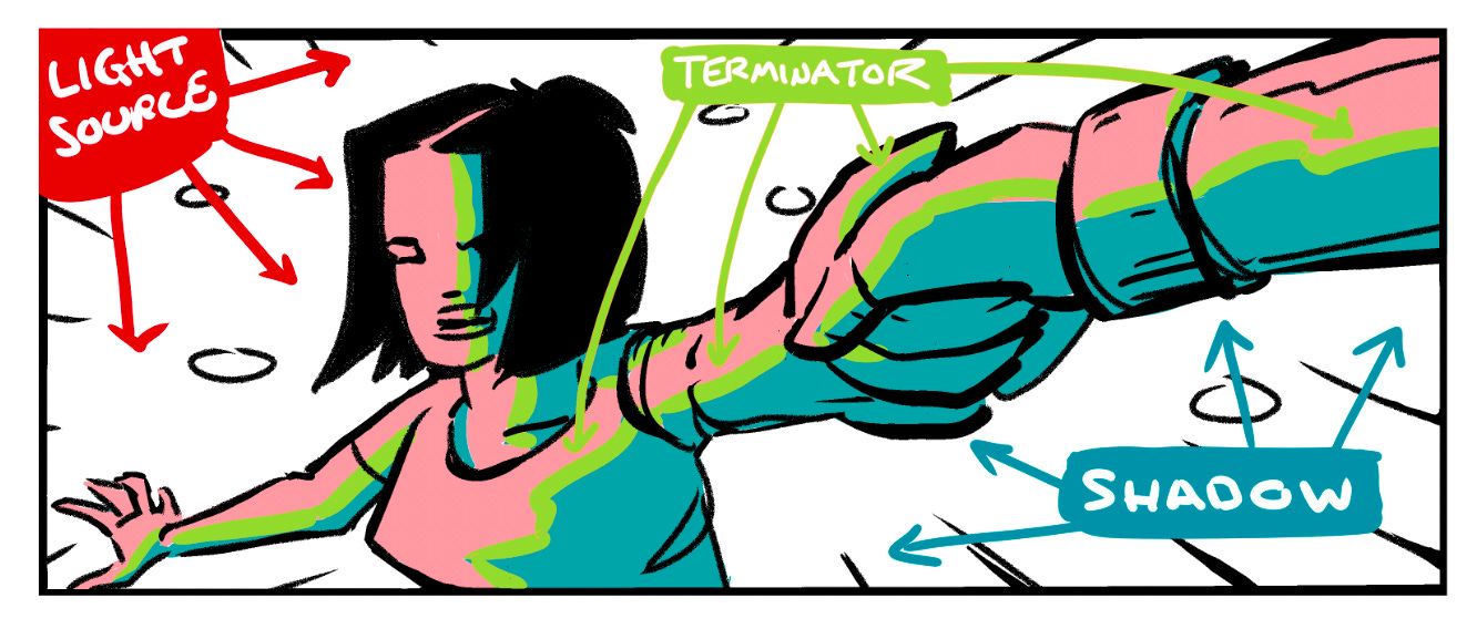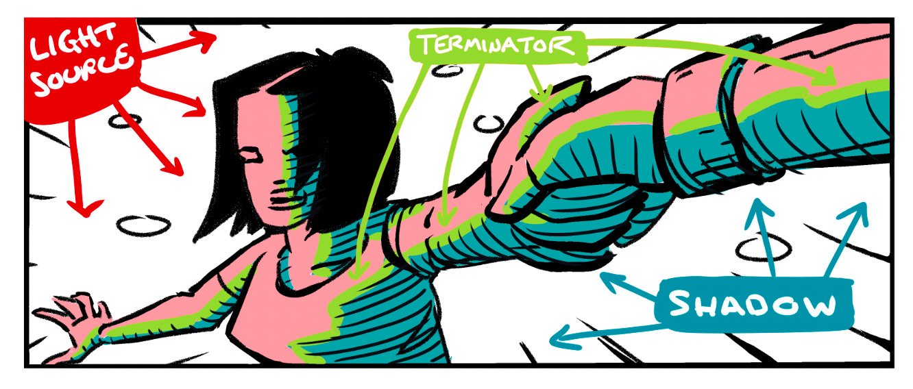 What coloring and inking share is something known as the terminator—the boundary where light and shadow meet. When working in color, those areas blend to create an in-between tone, as shown by the green in the example above.