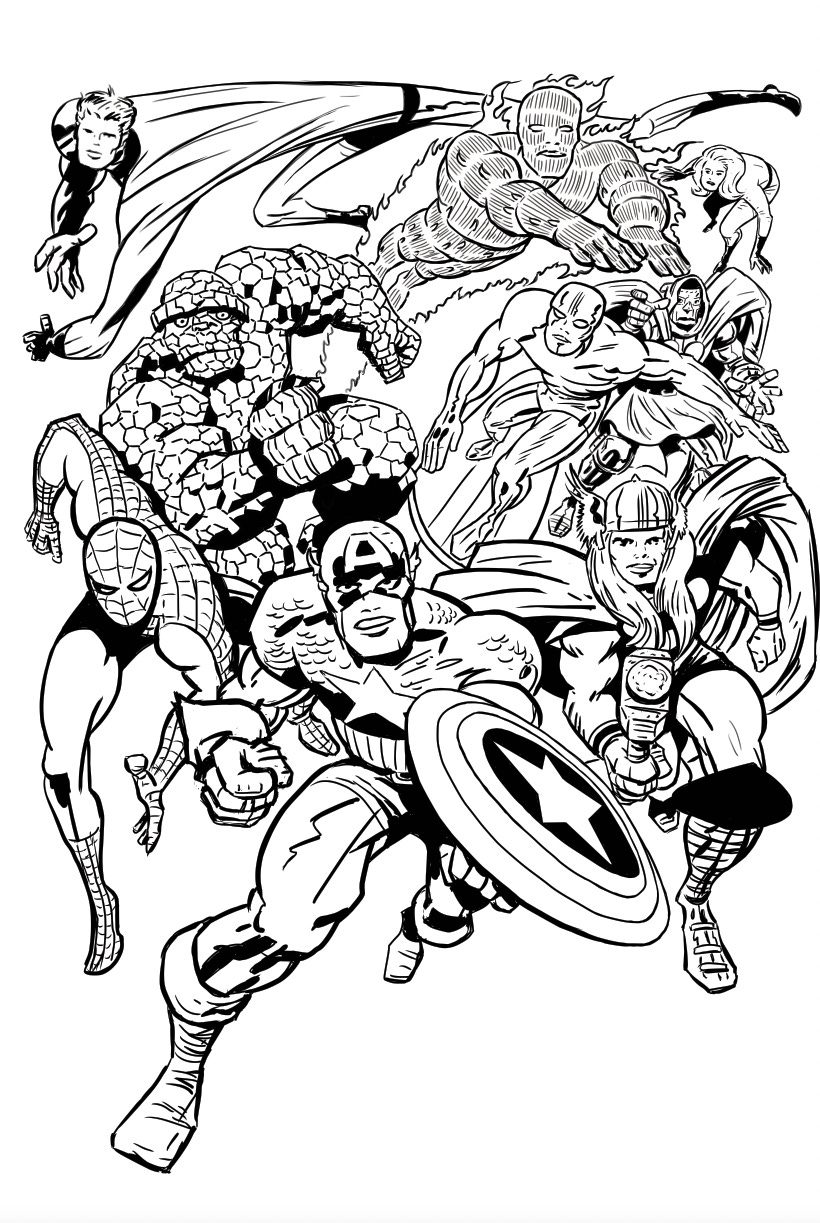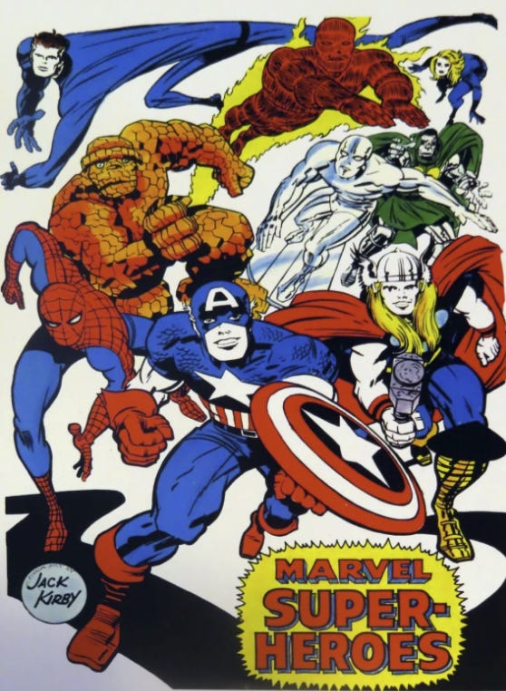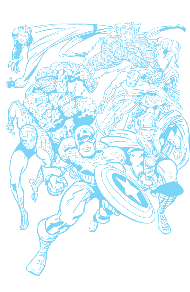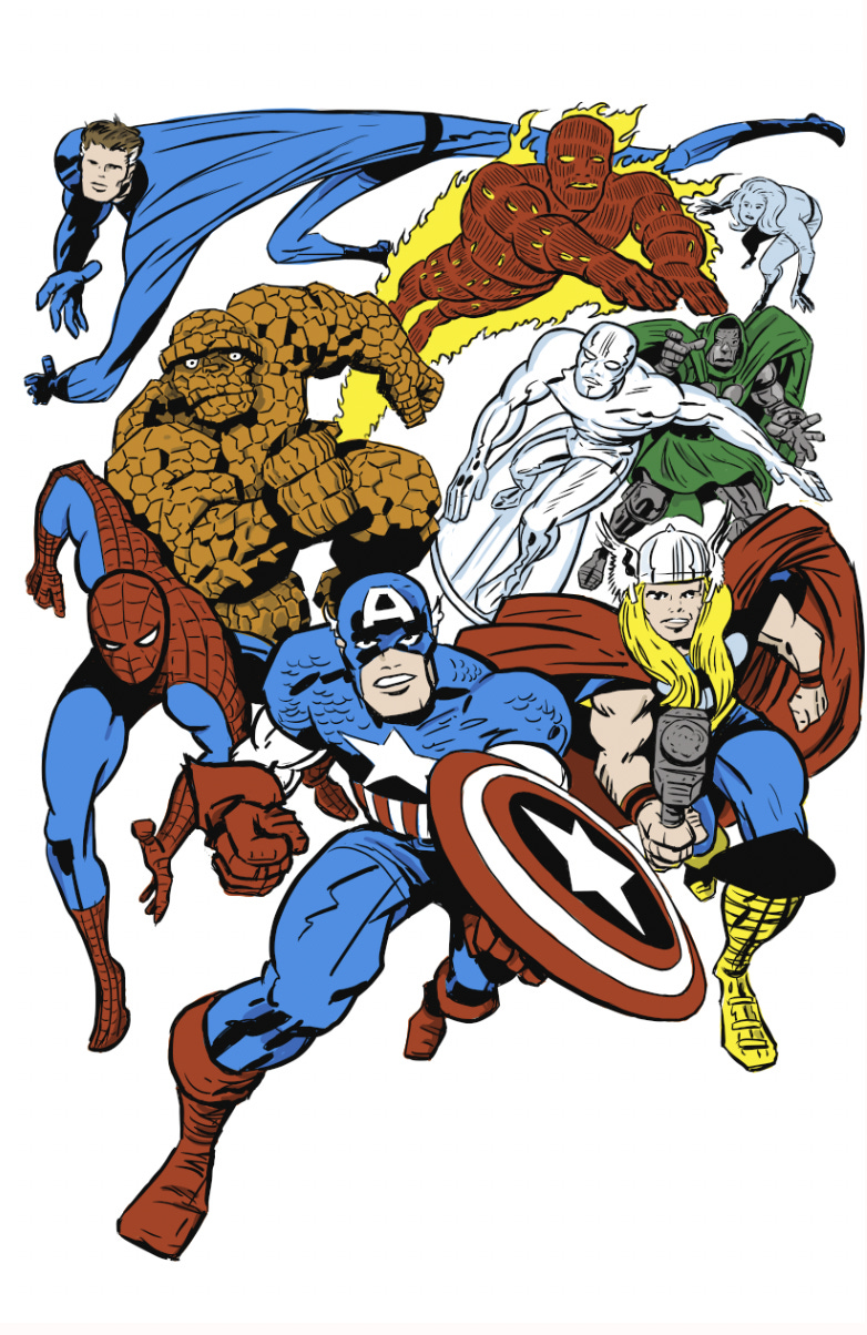 I began by searching the web for the perfect image. After a few searches, I stumbled upon the perfect image (below). It has many of Kirby’s creations and that classic Silver Age Marvel feel.