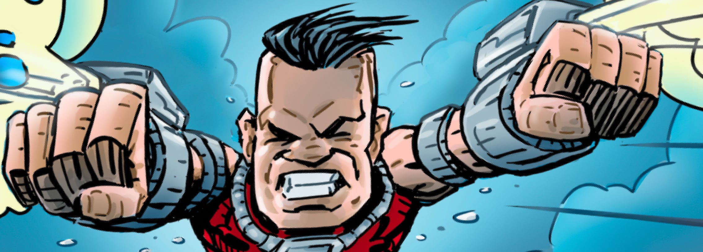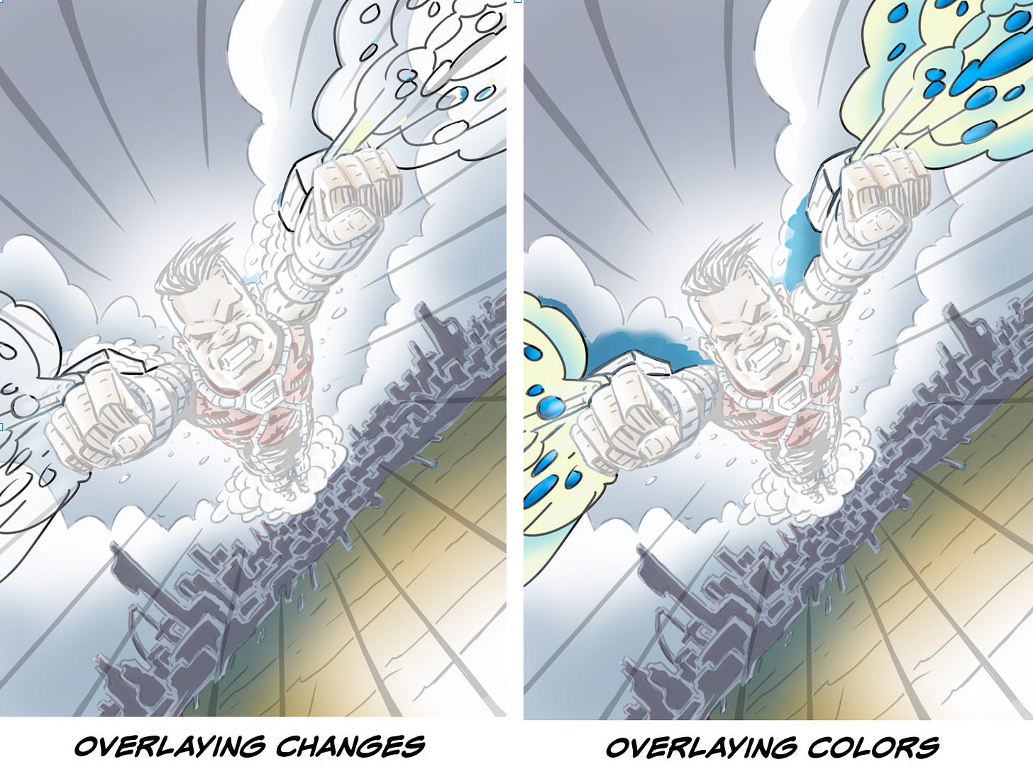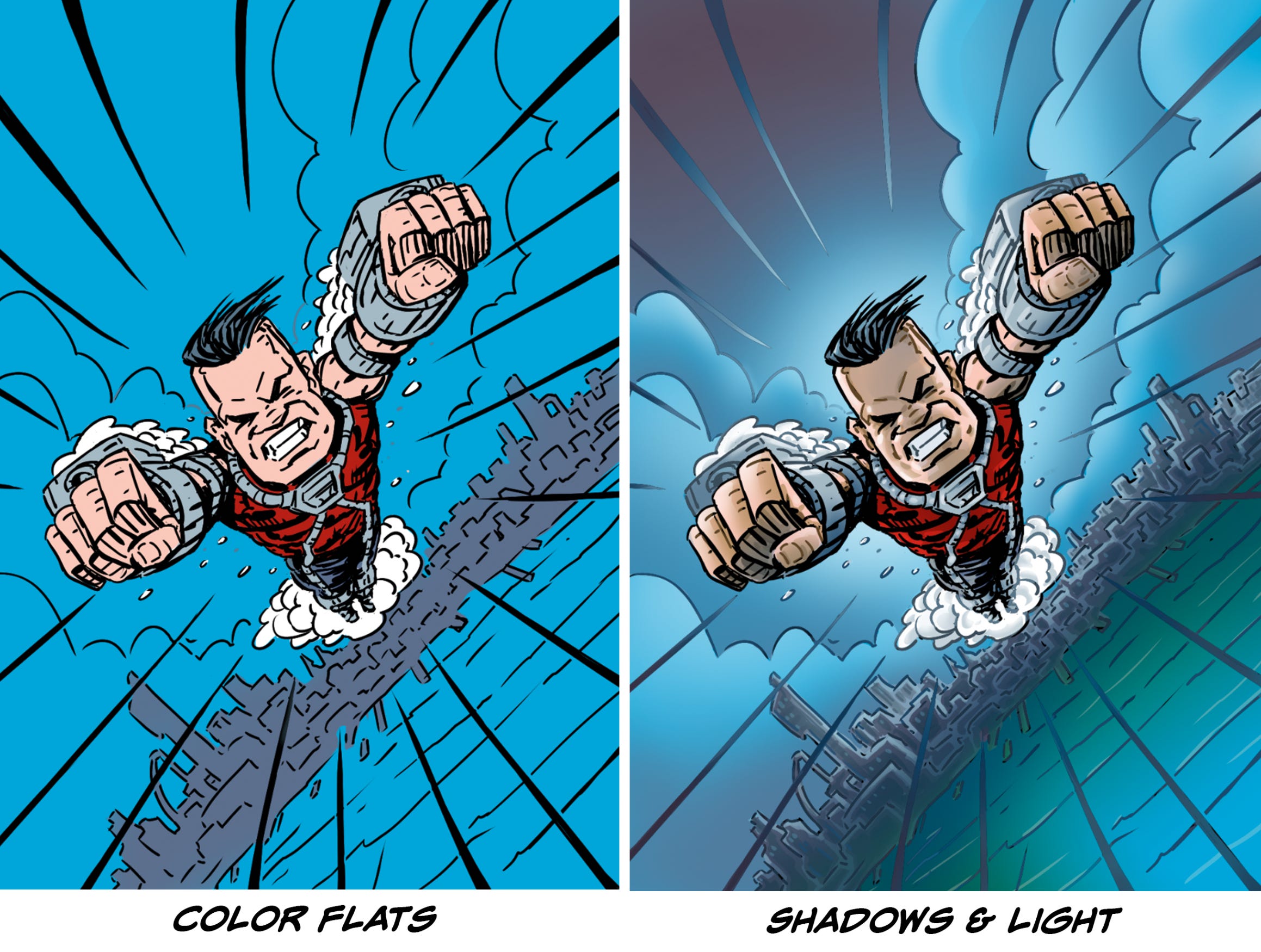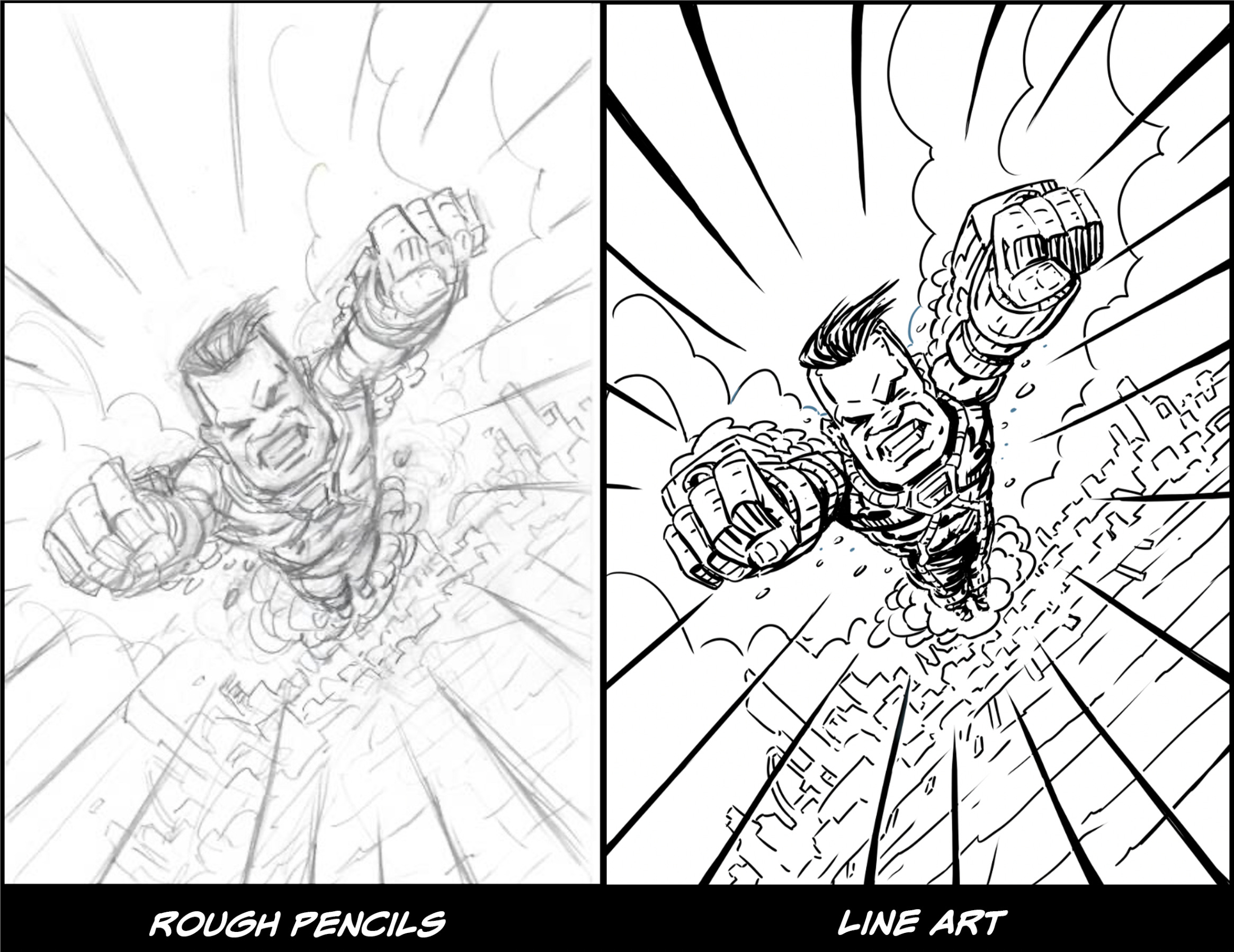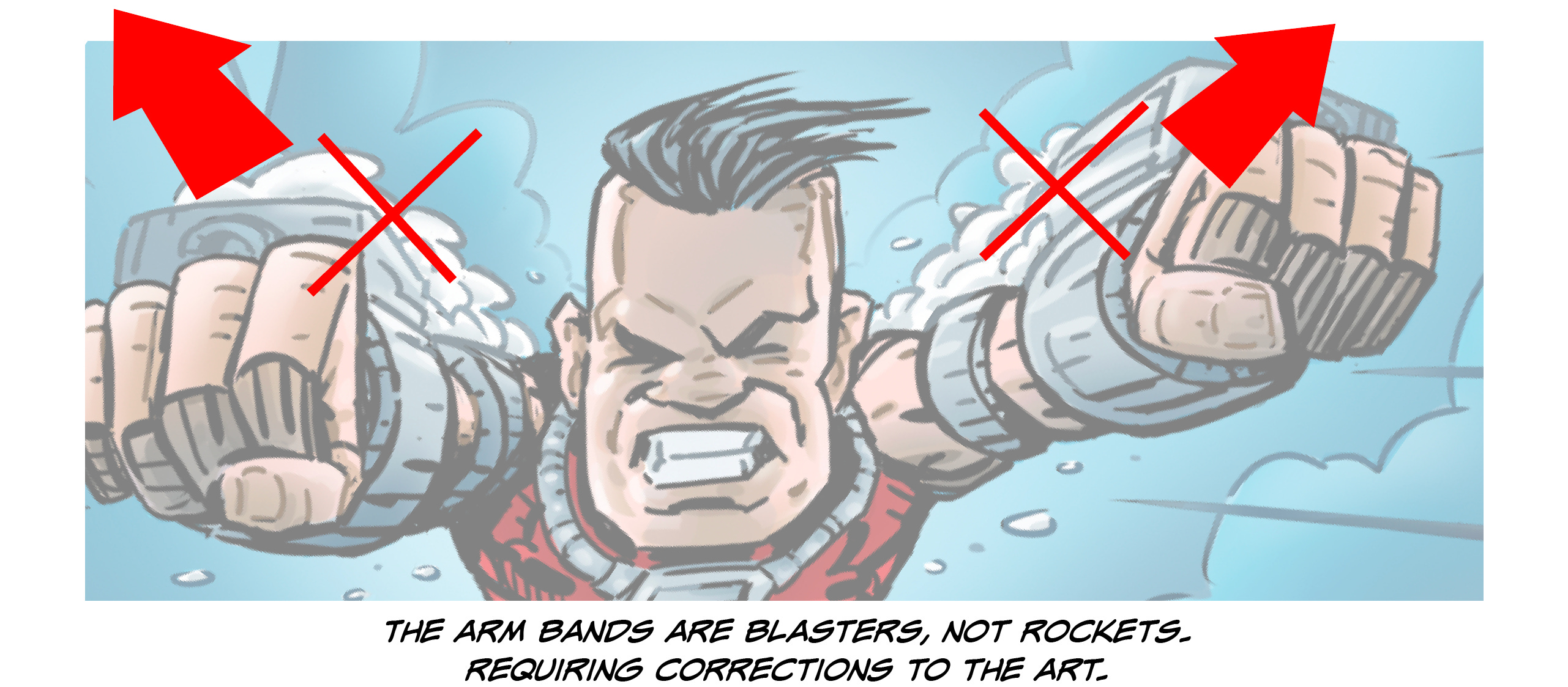 Rammur flies using fusion-powered rockets attached to his suit, so I sketched a series of roughs, pushing the perspective and aiming for a dramatic, straight-at-the-reader flight shot. After scanning the roughs and importing them, I completed the line art and added color.