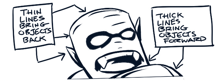 Digital color has expanded the comic artist’s toolbox in amazing ways, but it doesn’t replace one of the most fundamental tools for building space: the line itself. Working only in black, the thickness of a line determines where the viewer places an object within the scene.